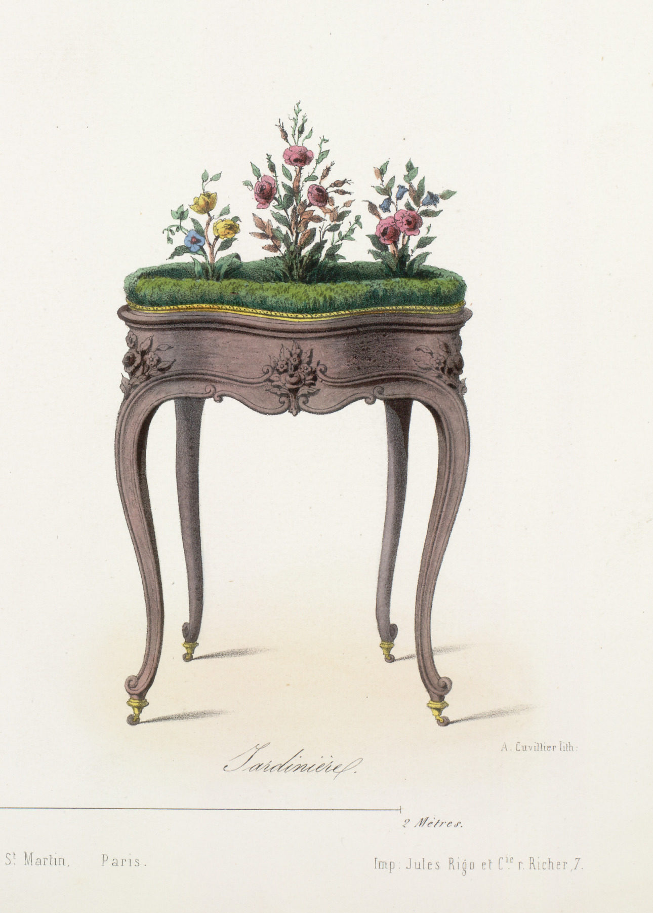 'Le Garde meuble,' (1839) by Desiré Guilmard (CC0); cover from 'Window and Indoor Gardening,' (1936) by T.W. Sanders (CC0); cover from 'Rustic Adornments for Homes of Taste,' (1895) by Shirley Hibberd (CC0).