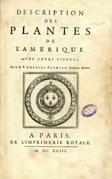 Image credits (top to bottom, right to left): Cover from 'Description Des Plantes D'Amerique', by Charles Plumier (CC0); inner illustration from the same book; cover from 'Flora Peruviana et Chilensis,' by Hipolito Ruiz and Jose Pavon (CC0); cover from 'Historia Naturalis Brasiliae,' by Georg Marcgraf (CC0).